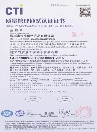Shenzhen Wolck Network Product Co.,Ltd. is located in Shenzhen city which is one of the first-tier cities in China. Wolck company is a high-tech enterprise specializing in the development of technology and equipment for EPON/GPON/CATV equipments.Production and equipments detailed can be shown online, and all products will be passed the test before shipment.